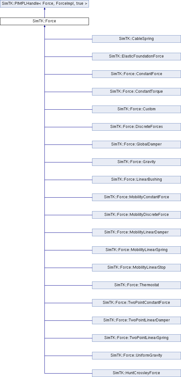 A Force object applies forces to some or all of the bodies, particles, and mobilities in a System. There are subclasses for various standard types of forces, or you can create your own forces by deriving from Force::Custom.